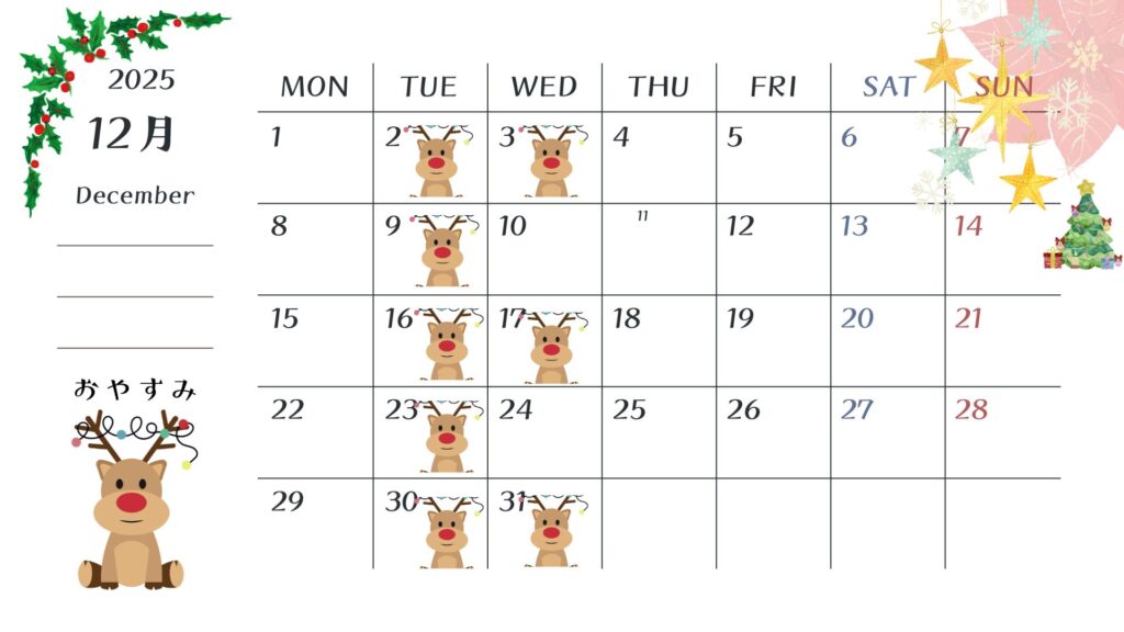 年末年始のお休みは12月30日(火)から1月3日(土)までとなり