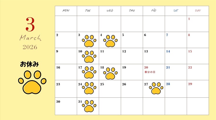 2026年3月のカレンダーは下記の通りです。